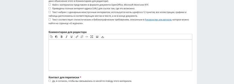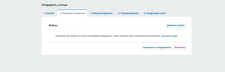 Следующий шаг: 1 Перейти в раздел «Отправить материалы». На стартовой странице выбрать язык материала и раздел, соответствующий содержанию рукописи. Далее, прежде чем продолжить отправку материала, на следующей строке вы должны прочитать и подтвердить, что вы выполнили все требования ниже, и указать, что вы согласны на сбор и хранение данных об авторском материале в соответствии с заявлением о конфиденциальности. После заполнения всех строк инструкции нужно нажать кнопку «Сохранить и продолжить».